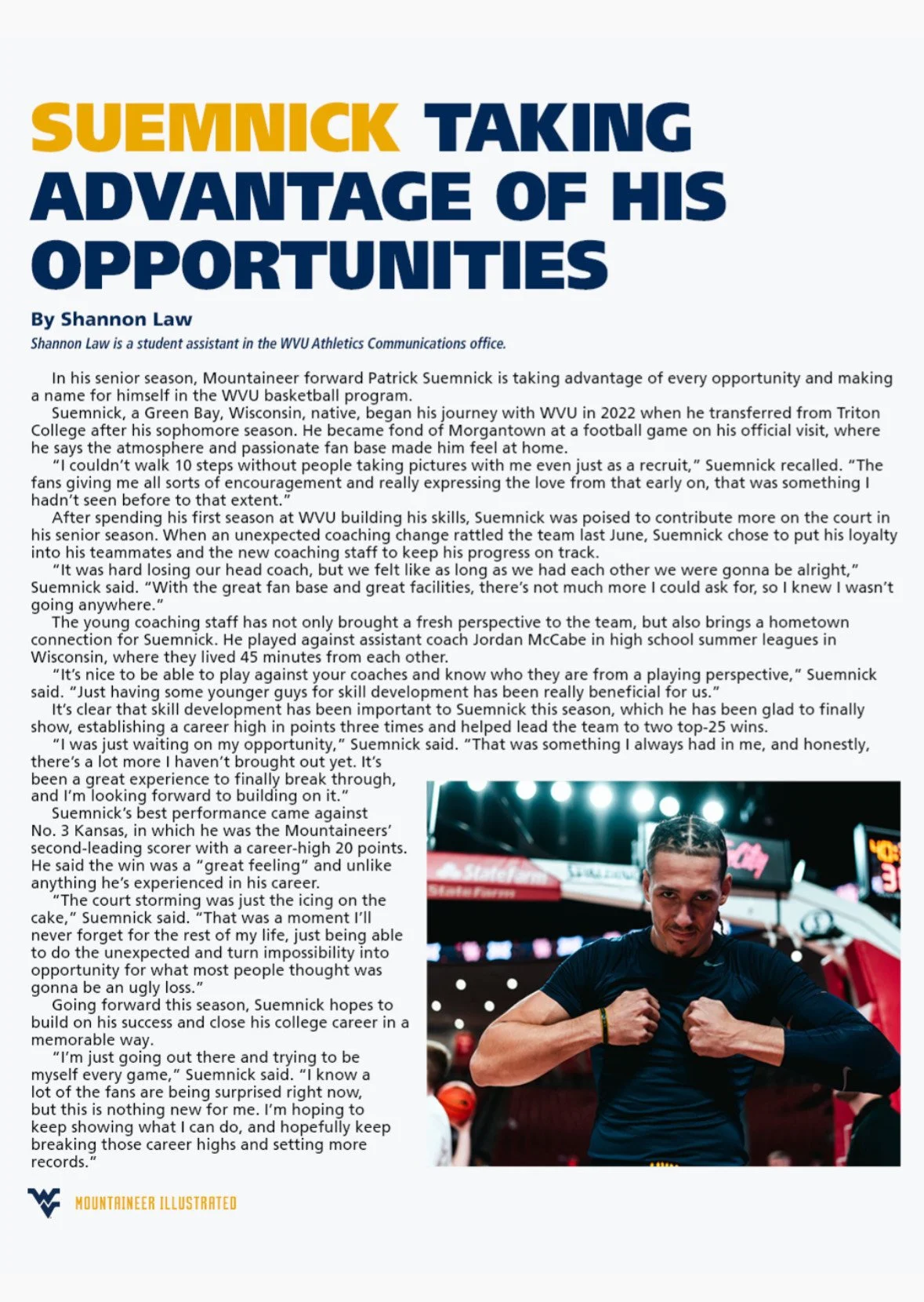 As a communications intern with the West Virginia University Athletic Department, I conducted in-depth interviews with fan-favorite football and men’s basketball players and wrote feature stories published in Mountaineer Illustrated. I am also published in WVU’s student newspaper, the Daily Athenaeum, for a feature story I wrote about Dr. Clay Marsh, chancellor and executive dean for WVU health sciences and COVID czar for the state of West Virginia during the pandemic.